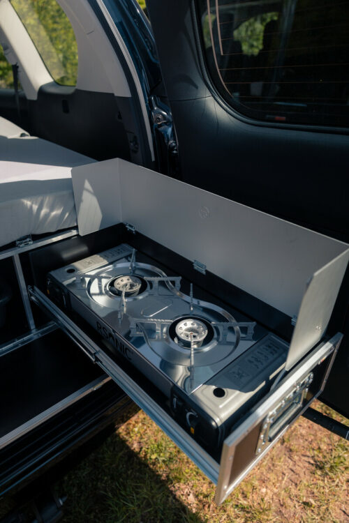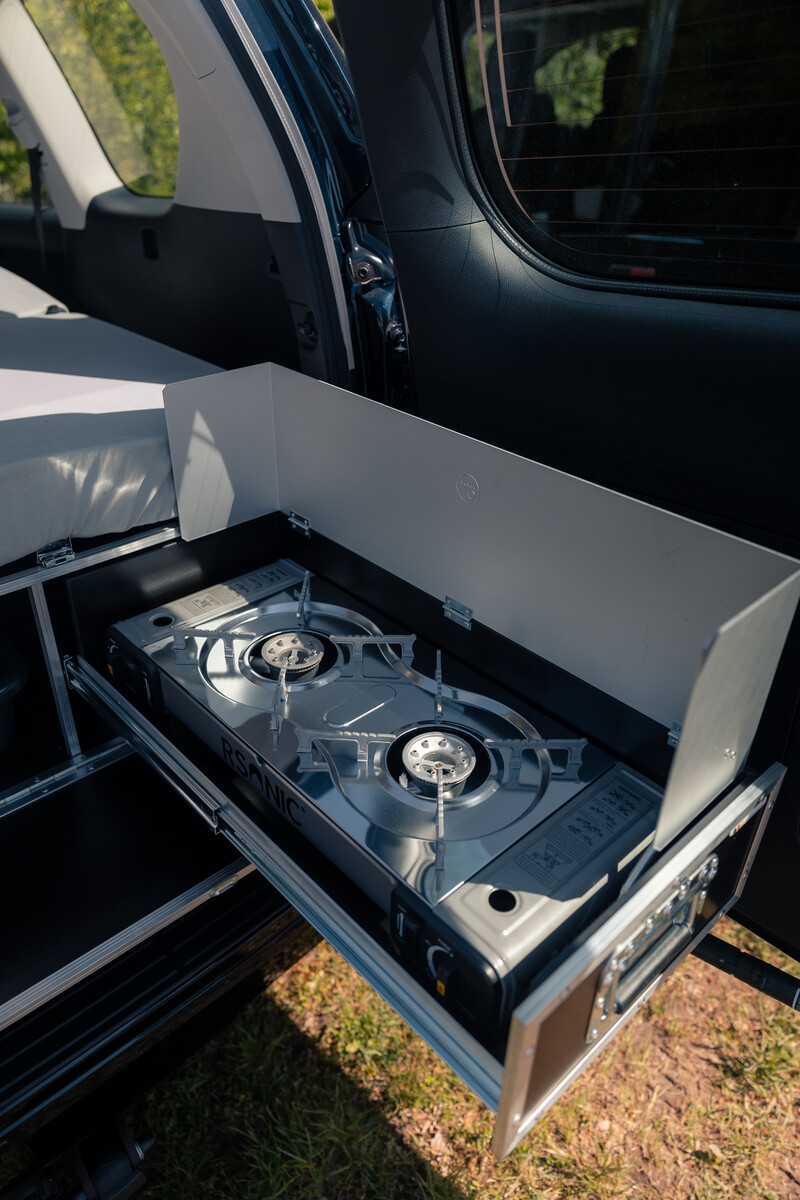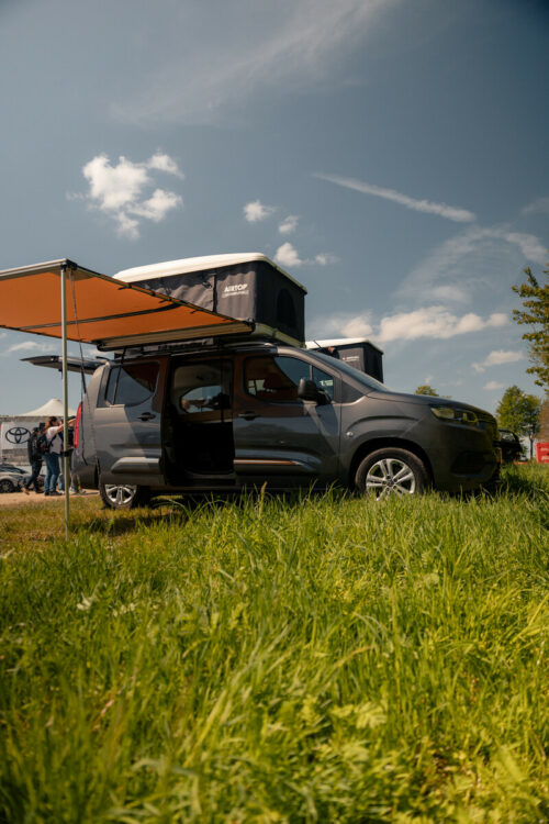 Beim Toyota Proace City Verso stehen eine Campingbox von QUQUQ für 2.620 Euro, das Dachzelt Airtop Medium für 3.990 Euro sowie die Touring Markise von ARB für 700 Euro in der Zubehörliste. Die Campingbox punktet mit zweiflammigem Gaskocher, zwei Zehn-Liter-Kanistern für Frisch- und Abwasser, zwei Schüsseln und ausklappbarem Bett mit Kaltschaummatratze. Die Markise kann optional noch mit Seitenwänden, Frontwand und Markisenzelt erweitert werden.