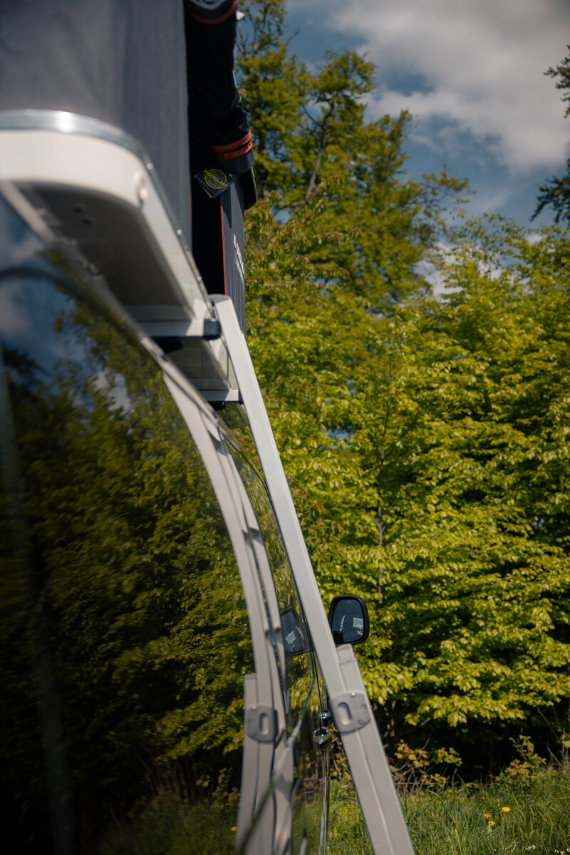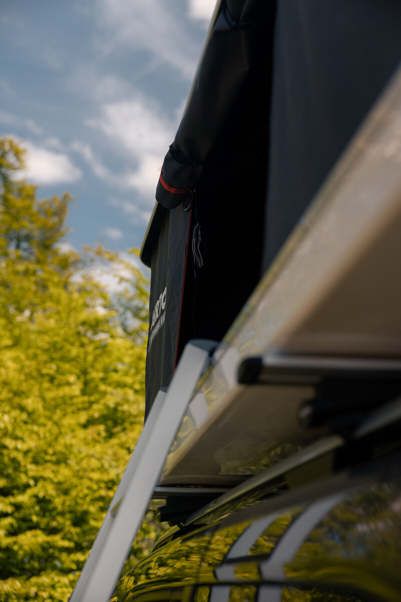 Den Toyota Pickup Hilux kann man gleich beim Kauf – oder auch später – mit dem 2.450 Euro teuren Dachzelt Simpson III von ARB bestücken lassen. Das enthaltene Bett bietet eine Liegefläche von 2,4 x 1,4 Meter. Als Sonnen- und Regenschutz wird eine 2,55 Meter lange Kuppelmarkiere von RHINO-RACK angeboten. Kostenpunkt: 385 Euro. Auch hier gibt es auf Wunsch noch Seitenwände und eine Frontwand dazu.