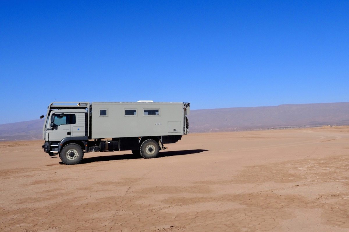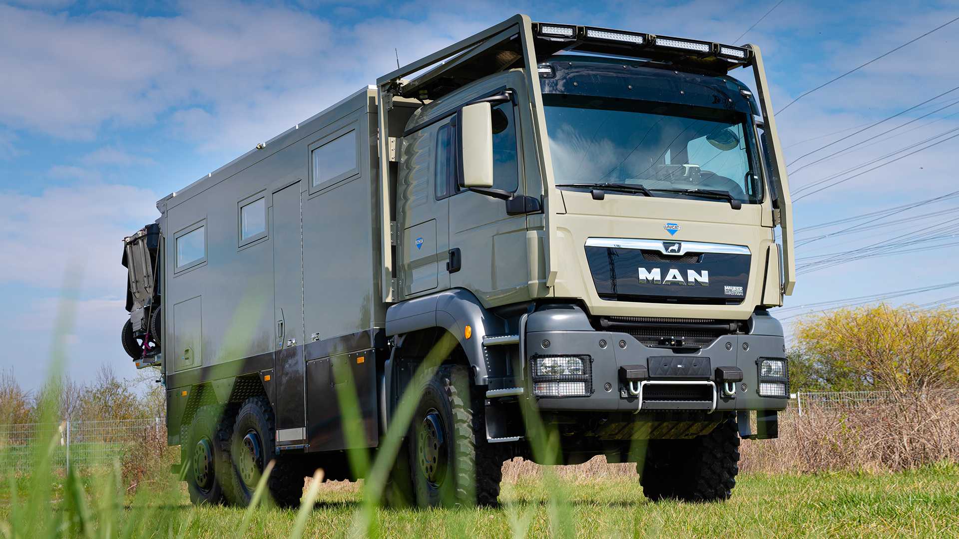 Mit dem eigenen Camper zu den entlegensten Punkten der Erde – ein Traum für viele, die mit überfüllten Campingplätzen nichts anfangen können und lieber für sich allein die Natur genießen wollen (ohne auf ein gewisses Maß an Luxus verzichten zu wollen). Das nötige Kleingeld vorausgesetzt, führt bei dem Wunsch nach einem Extrem-Camper, mit dem diese Ziele erreichbar sind, kein Weg am deutschen Hersteller Unicat vorbei. Neu im Programm hat die in Dettenheim bei Karlsruhe ansässige Firma den Unicat MD57, der auf dem allradgetriebene MAN TGM 18.340 4×4 mit 4,50 Meter Radstand und einem 6,9-Liter-Sechszylinder als Antriebseinheit basiert. Gekoppelt ist das 340 PS und 1.250 Nm leistende Aggregat an ein Tip-Matic-Getriebe mit zwölf Gängen. Für eine maximale Geländegängigkeit sorgen Längs- und Differenzial-Sperren an beiden Achsen sowie ein Verteilergetriebe mit Geländeuntersetzung.