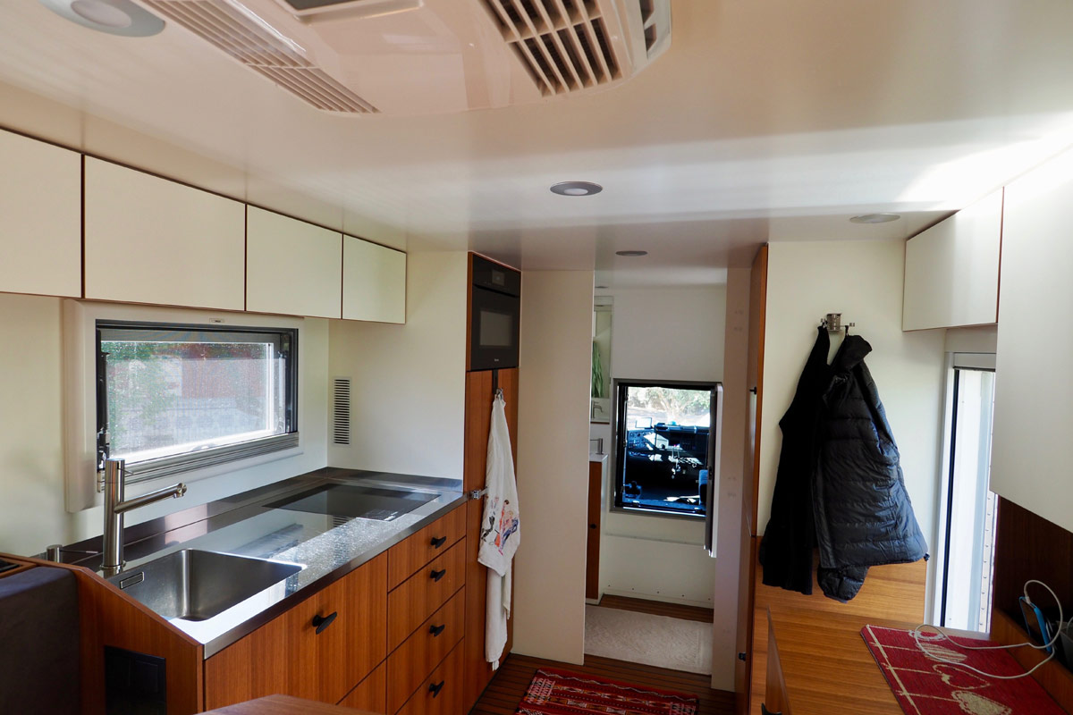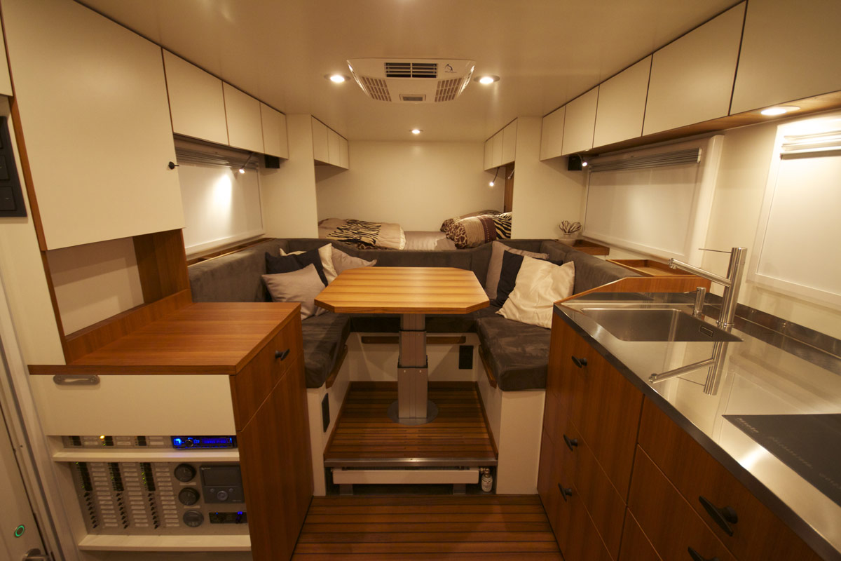 [adrotate group=“1″]Die auf einem Podest angeordnete Sitzgruppe mit schwenk- und drehbarem Tisch bietet mehreren Personen Platz. Dank des elektrisch absenkbaren Tischs kann hier bei Bedarf eine weitere Schlaffläche entstehen. In Fahrzeugmitte ist längs auf der Fahrerseite die Küche untergebracht. Sie bietet ein Induktions-Kochfeld und einen Backofen mit Mikrowelle sowie eine Kühl-/Gefrierschrankkombi.