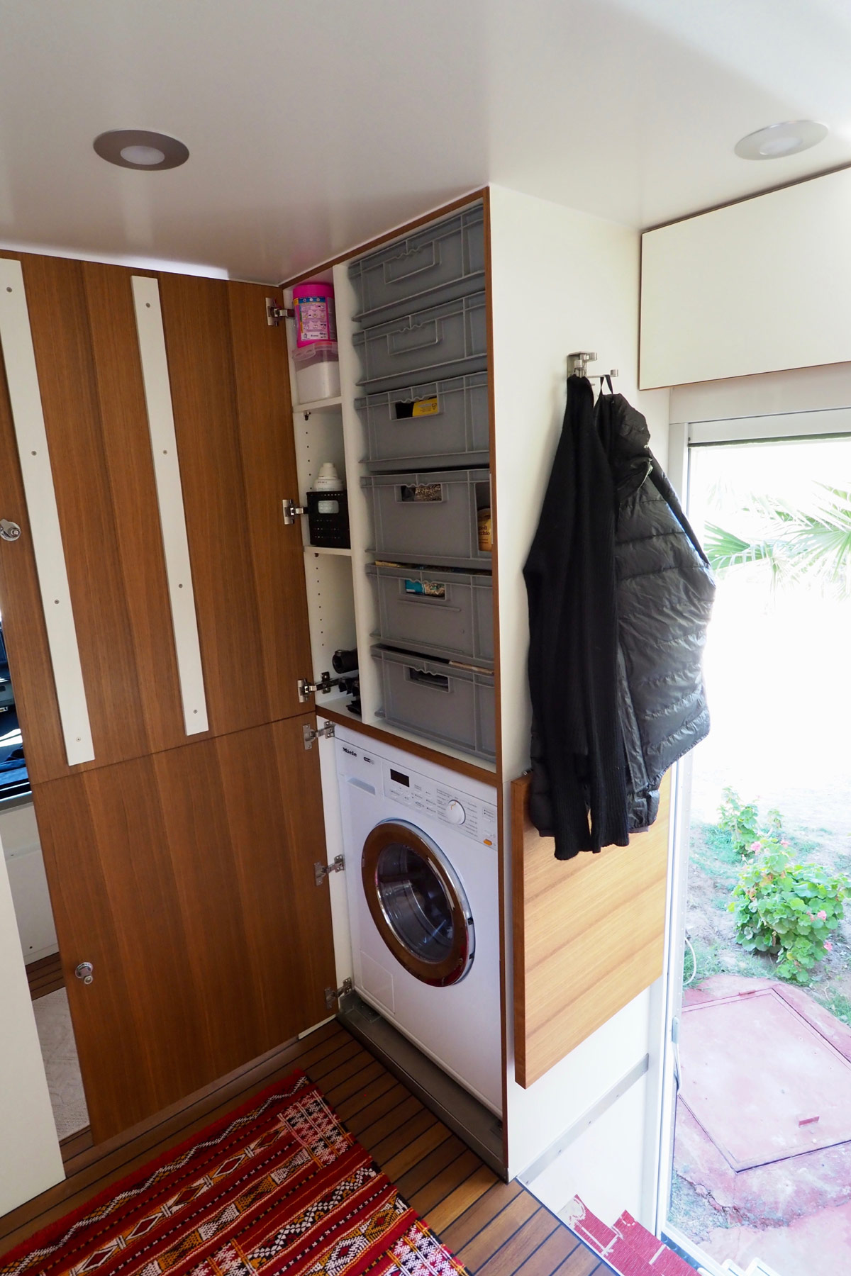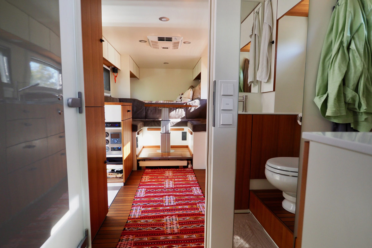 Ans Fahrerhaus schließt sich der Sanitärraum an. Toilette und geflieste Dusche sind getrennt und lassen sich mit einer um 90 Grad schwenkbaren Glastür zum Innenraum hin abtrennnen. Der Duschraum ist mit einem eigenen Heizkörper auch als Trockenraum nutzbar. Rechts der Einstiegstür in den Wohnaufbau ist eine Waschmaschine mit integriertem Trockner untergebracht.