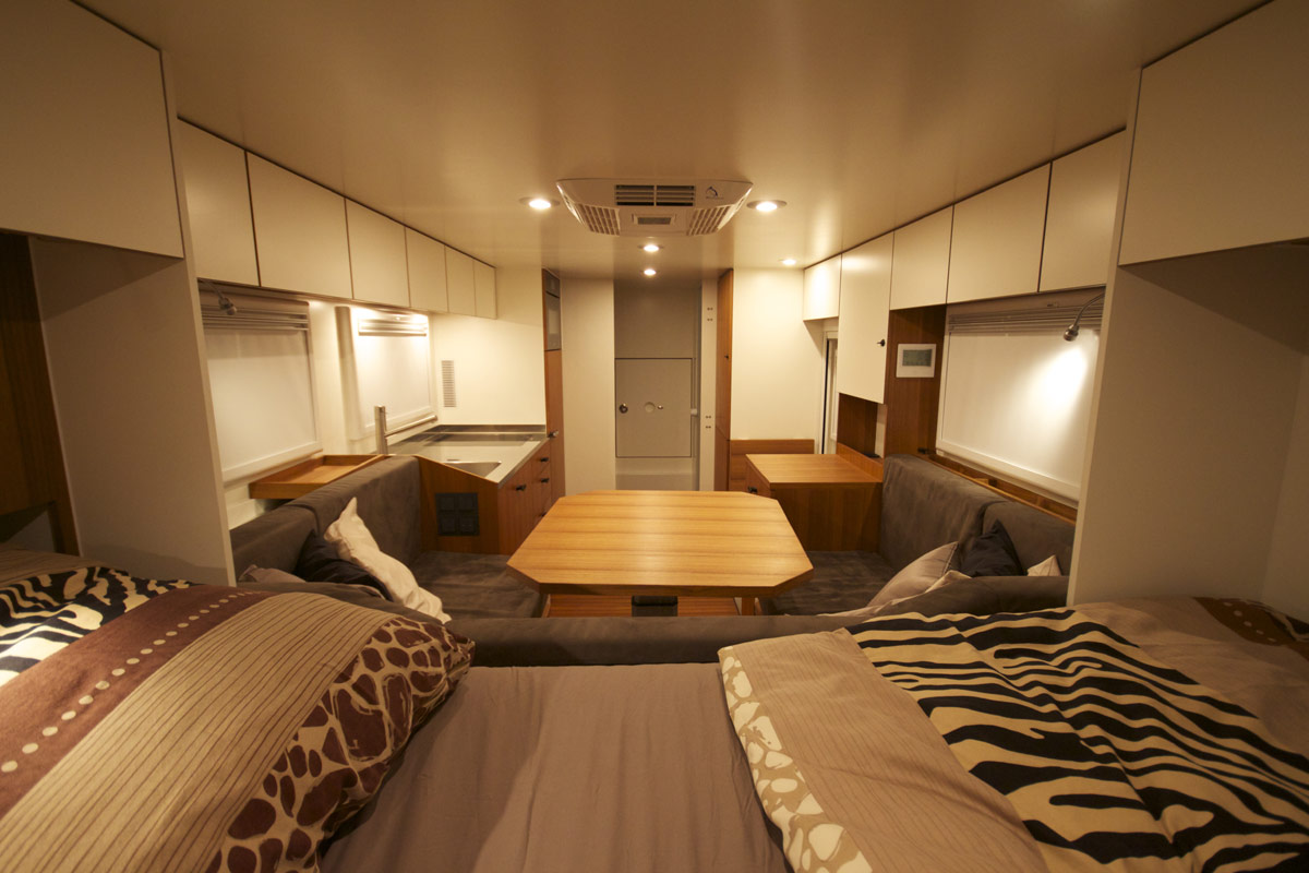 Im Heck quer angeordnet ist das 1,40 x 2,00 Meter große Doppelbett. Es ist ausgestattet mit Federung, Unterlüftung, Heizung und Komfortmatratze. Zur davor liegenden, U-förmigen Sitzgruppe mit Alcantara-Polstern wird es durch seitlich hochgezogene Trennwände abgegrenzt, Dachschränke an den Seiten bieten reichlich Stauraum.