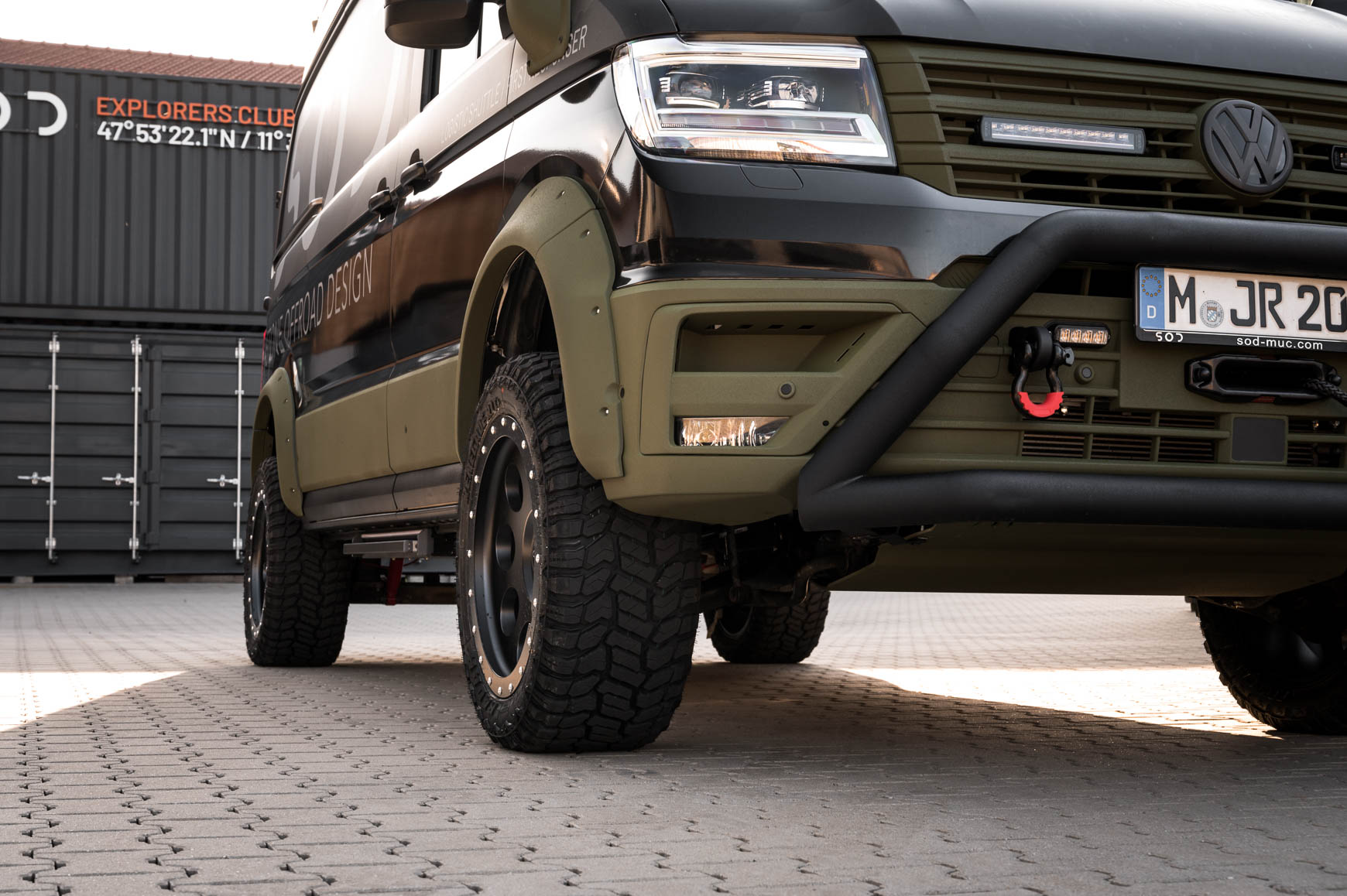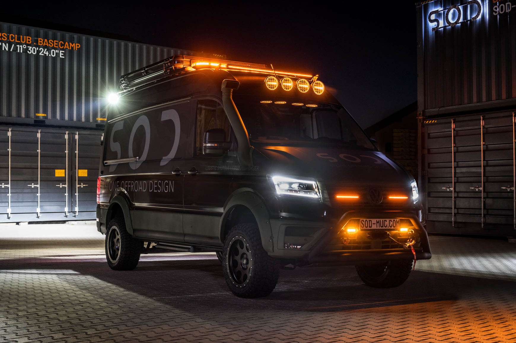 Nach dem Eingriff von SOD (Stone Offroad-Design) punktet der Camper mit satten 50 cm Bodenfreiheit und 120 cm Wattiefe. Montiert werden außerdem eine neue Bereifung von Delta (285/50 R20), ein Unterfahrschutz, eine Seilwinde mit Schwerlastschenkel, Frontbügel, Schnorchel, Radhausverbreiterungen, eine Leistungssteigerung auf 250 PS sowie eine standfestere Bremsanlage an beiden Achsen. Zudem könnt ihr durch eine Auflastung auf fünf Tonnen jede Menge Verpflegung und Ausrüstung mitnehmen. Gleichzeitig steigt die Anhängelast auf 3,5 Tonnen.