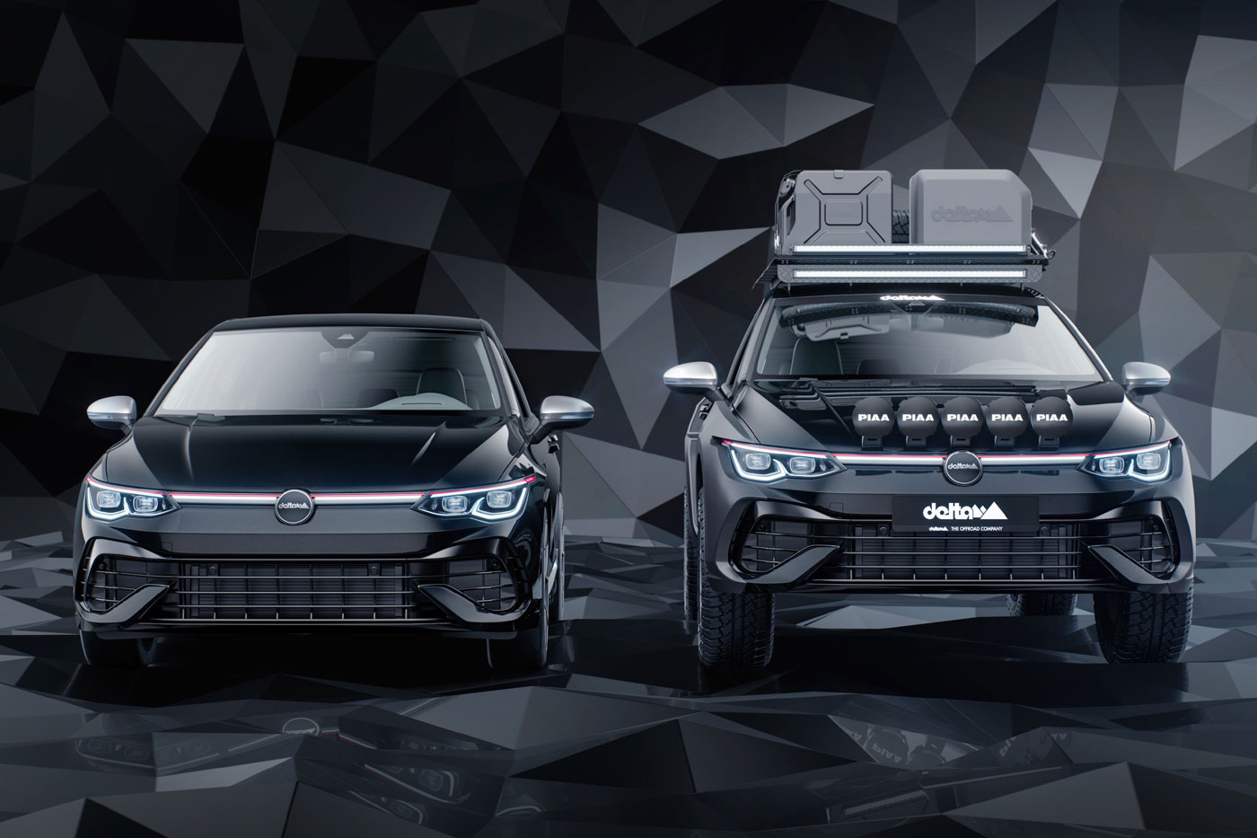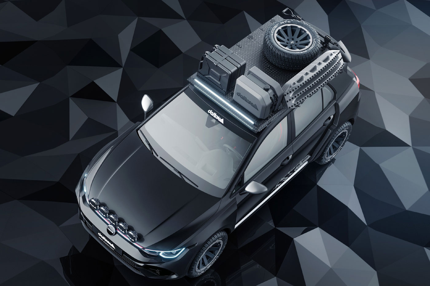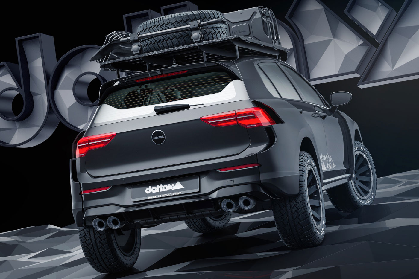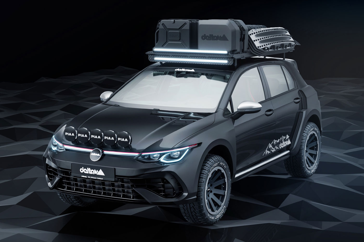 Wem die Bilder des neuen Allrad-Offroad-Golf nicht reichen, um endgültig überzeugt zu werden, dem seien folgende Infos mit auf den Weg gegeben: Durch ein Lift-Kit kann die Bodenfreiheit des Basisfahrzeugs (VW Golf R mit Allrad und 320 PS) um bis zu 80 mm erhöht werden. Damit erreicht der Golf Countryman von delta4x4 ähnliche Werte wie sein Vorbild. Markante Kotflügelverbreiterungen, amtliche 18-Zoll-Hanma-Felgen mit Loder AT Offroad-Reifen, Rally Style – PIAA LED-Scheinwerfer an der Motohaube und ein praktischer Dachträger runden das Paket ab.