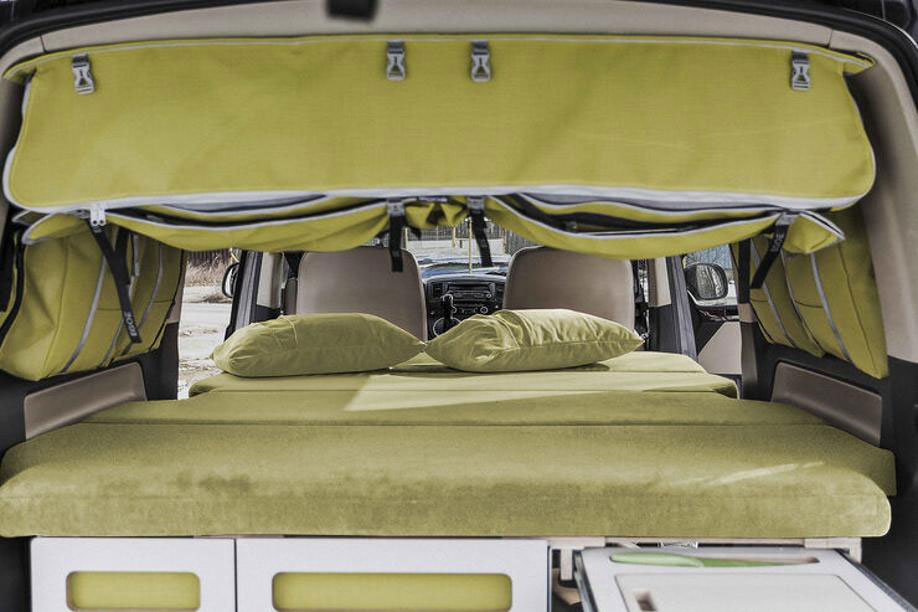 Zum Camper wird der Bus durch das verbaute Camping-Modul „i-Box“, die in den Kofferraumgestellt wird, einen Kocher (zwei Flammen), ein Spülbecken (25-LiterFrischwasser), eine Kompressorkühlbox, Staufächer und eine Bettkonstruktion mit Matratze (Doppelbett) beinhaltet – ihr kennt sowas ja. Der Ein- und Ausbau soll in 10 Minuten zu schaffen sein.