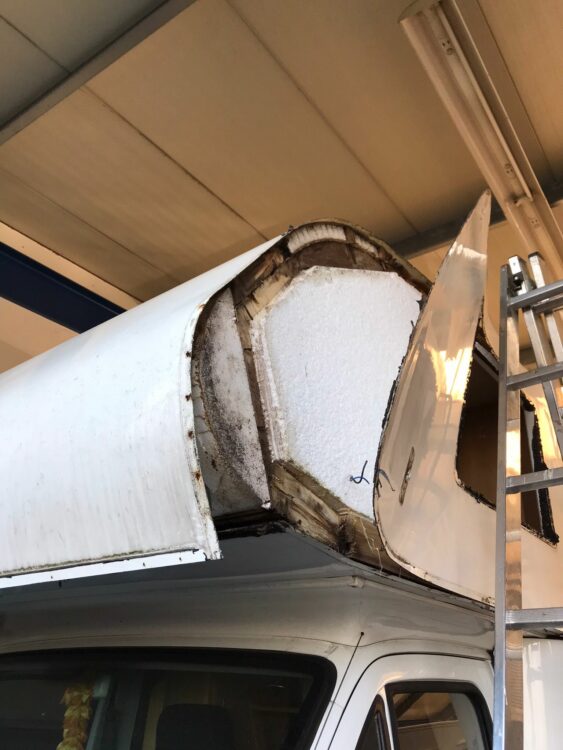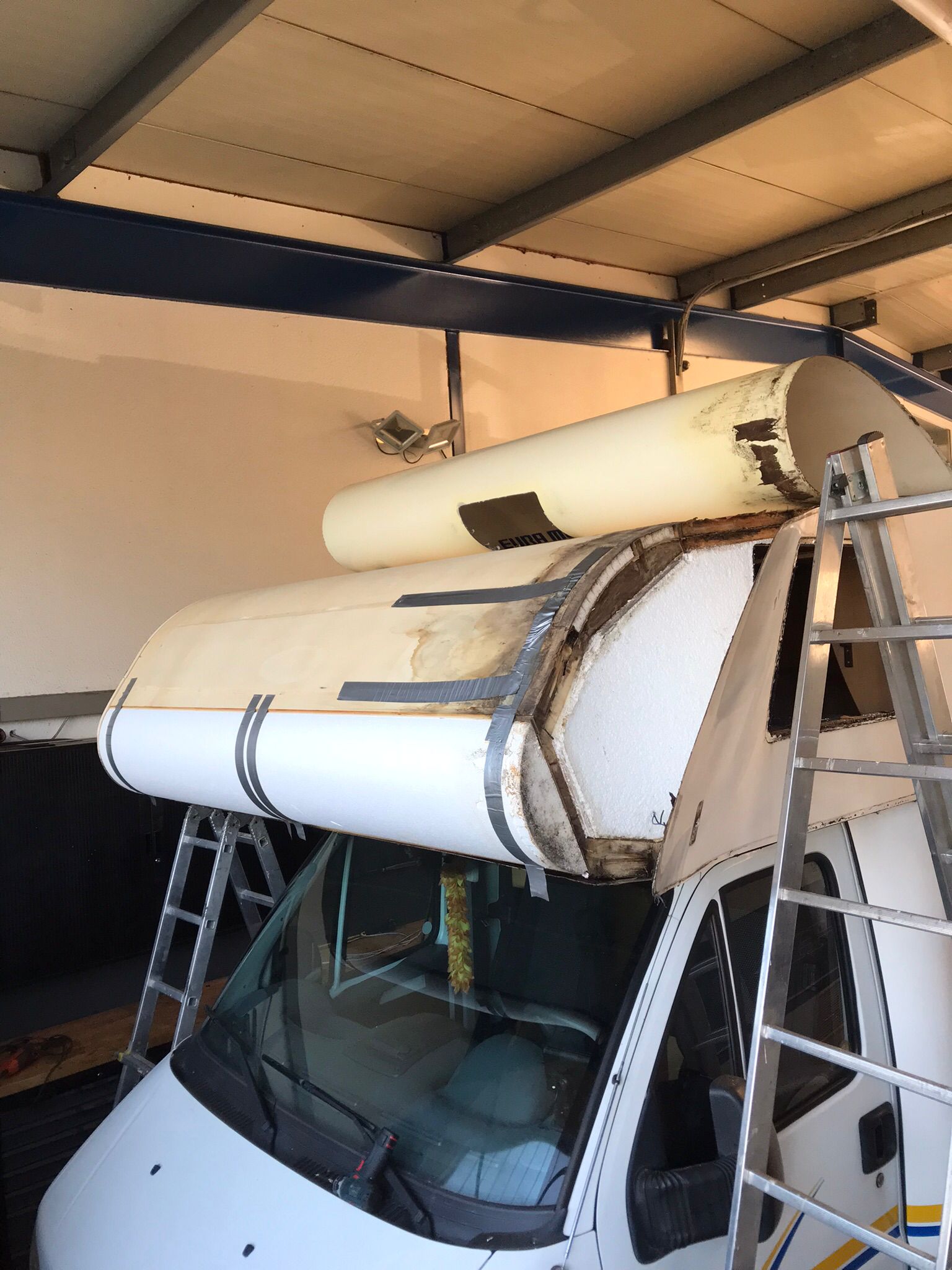 Im Einzelnen wurde der komplette Alkoven „nackig“ gemacht (von außen), beide Seitenfenster sowie die frisch eingebaute Dachluke wurden ausgebaut, die Übergänge zum Fahrerhaus mussten entfernt werden und im hinteren Bereich des Daches wurden die beiden Solarpanele neu montiert und abgedichtet.