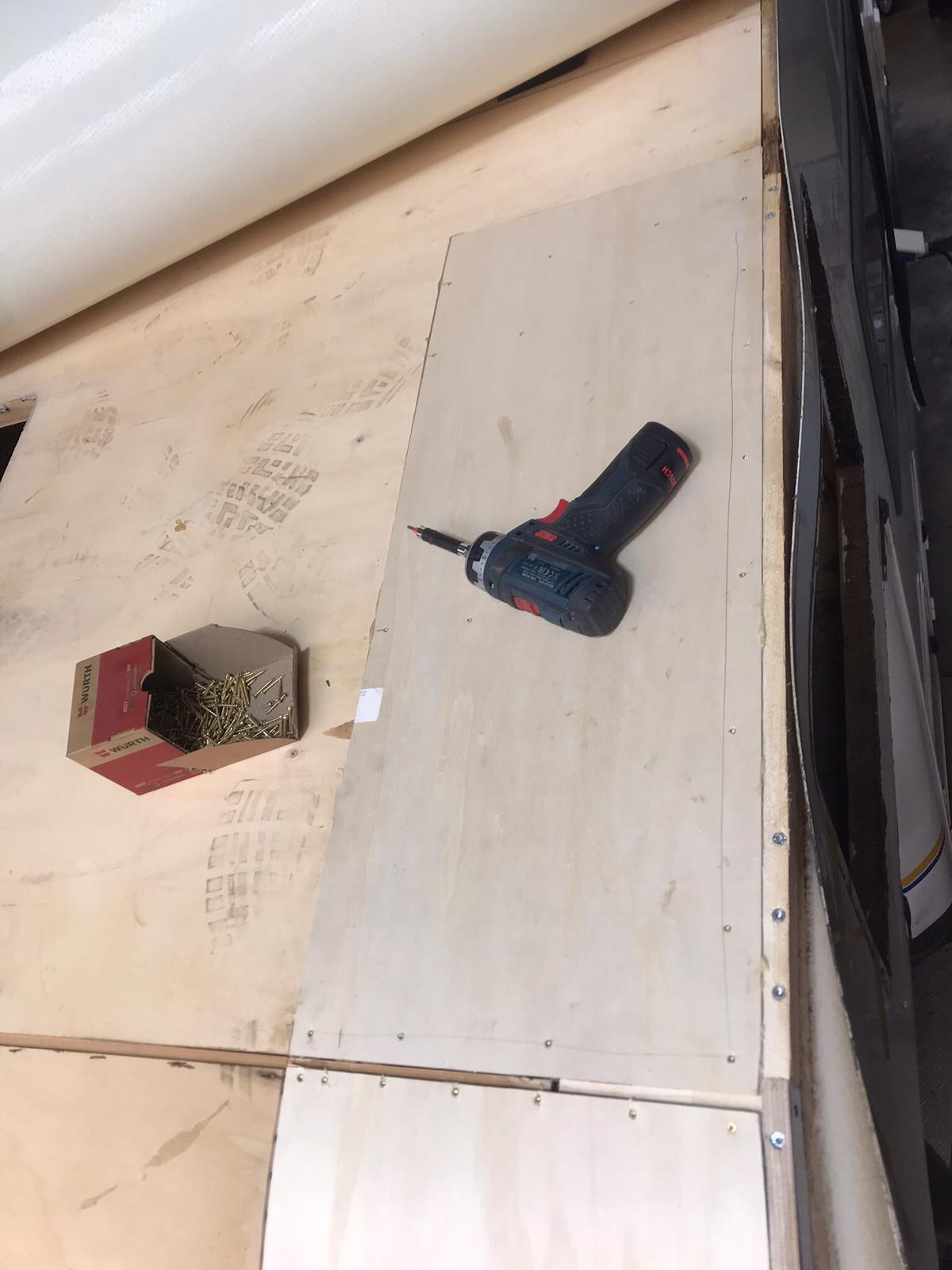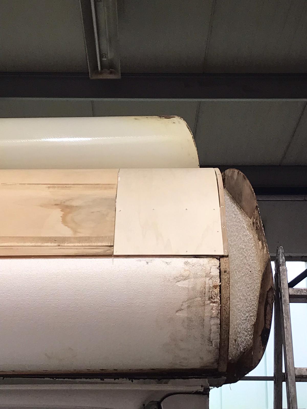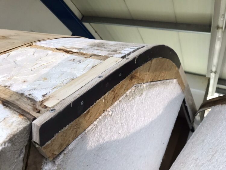 In der Zeit der Reparatur bin ich einmal nach Körl gefahren, um mir den Fortschritt anzuschauen und mich mit dem Monteur zu unterhalten. Der ist gelernter Tischer, arbeitet aber schon seit Jahren in der Wohnmobil- und Caravan-Branche und kann sich hier so richtig austoben. Er zeigte mir, wo das vergammelte Holz bereits entfernt und ersetzt worden war. Ich habe den Monteur Löcher in den Bauch geragt, weil ich leider immer unerträglich neugierig bin. Doch das hat er mit einem Lächeln über sich ergehen lassen und wurde nicht müde, mir Rede und Antwort zu stehen. Das war super, weil ich nun deutlich besser verstehe, wie so ein Alkoven aufgebaut ist, wo die tragenden Teile laufen und wie sich die PVC-Außenhaut verhält, wenn man sie biegt.
