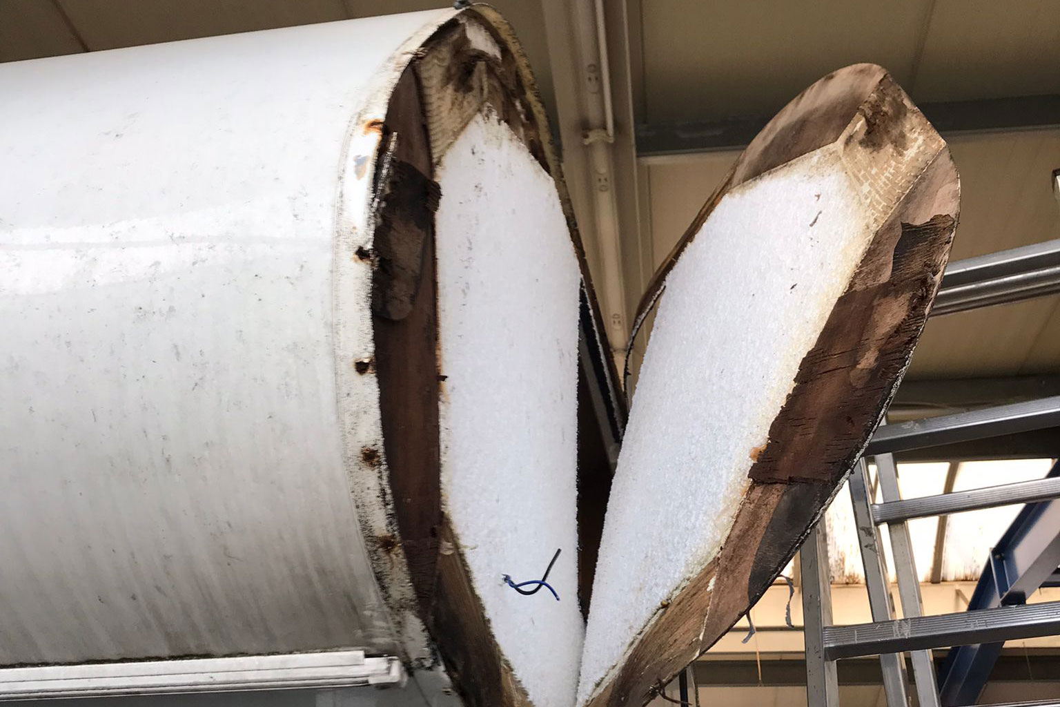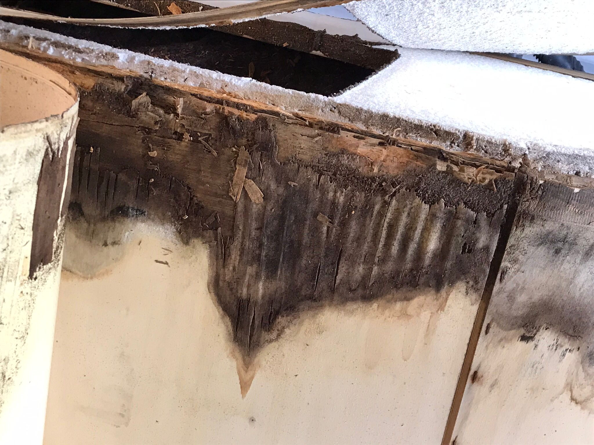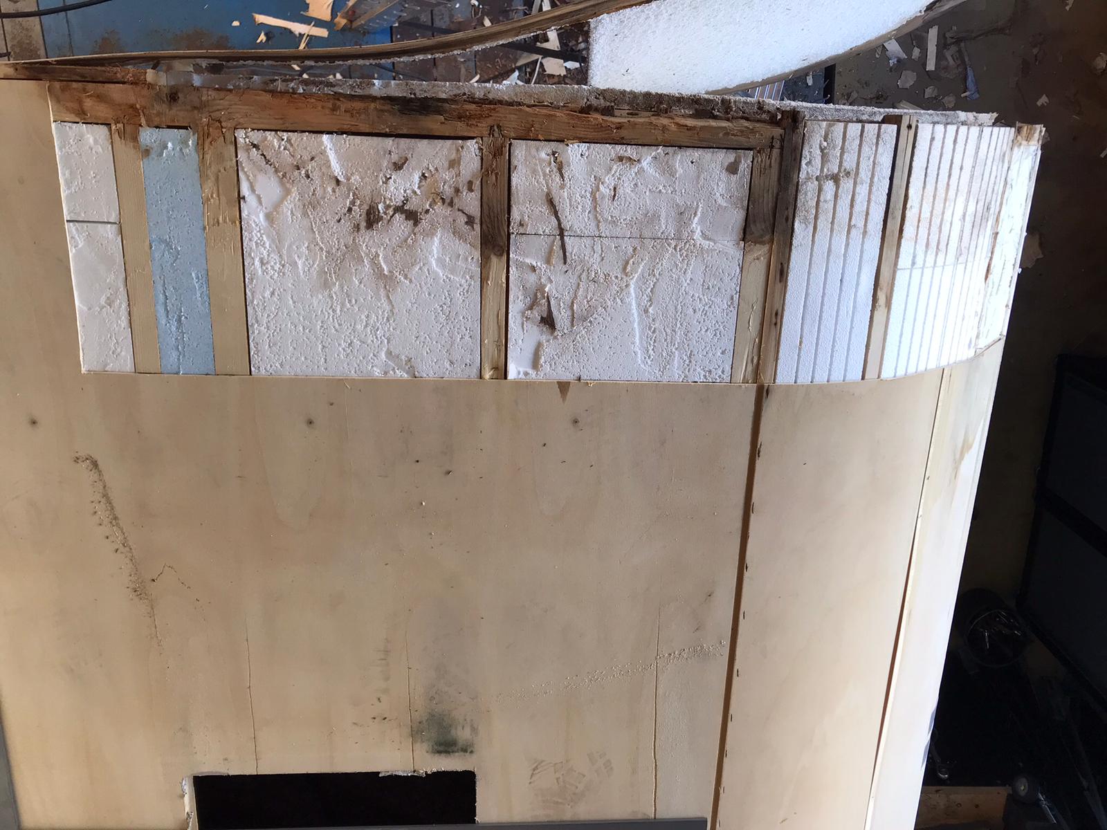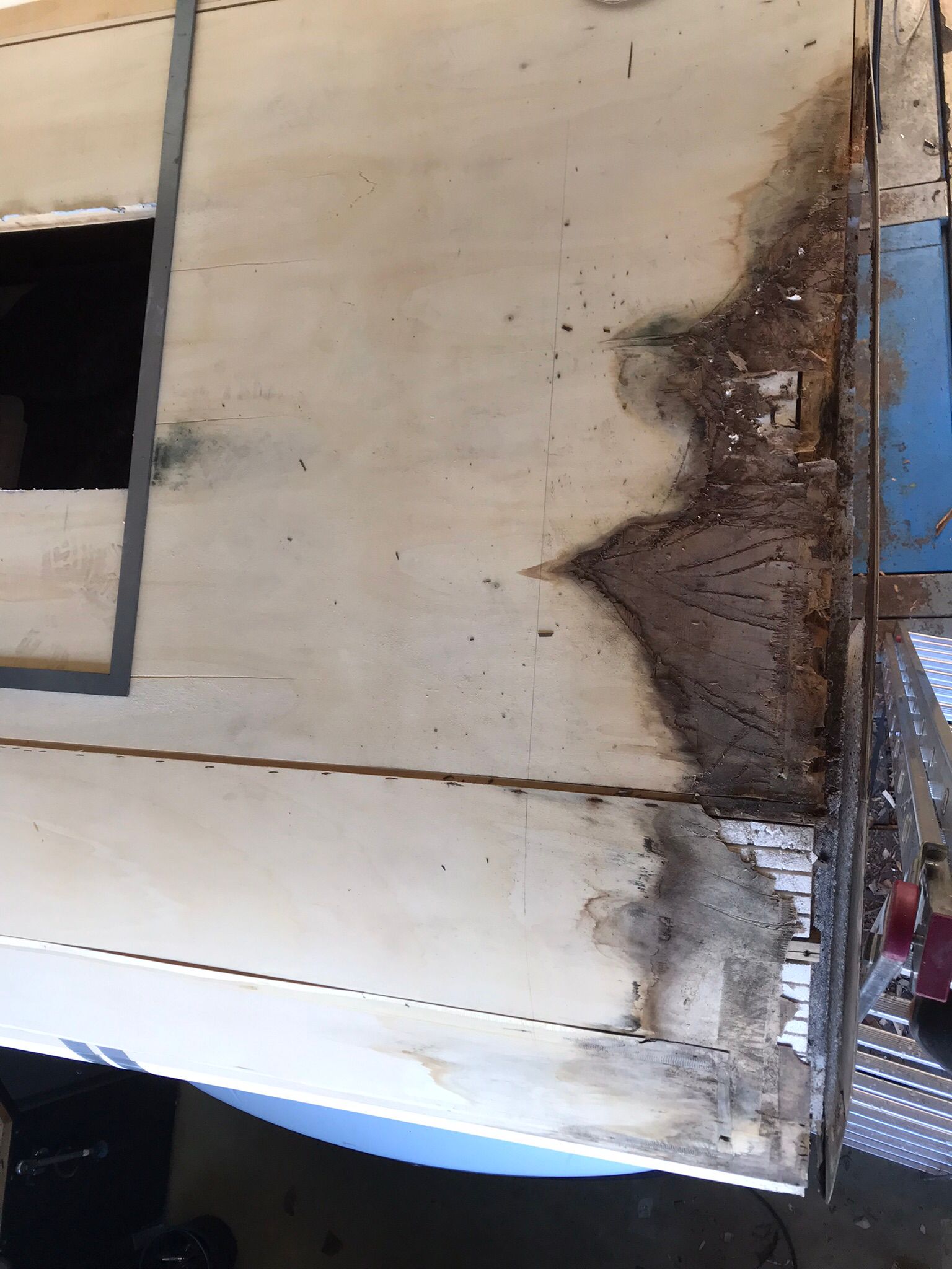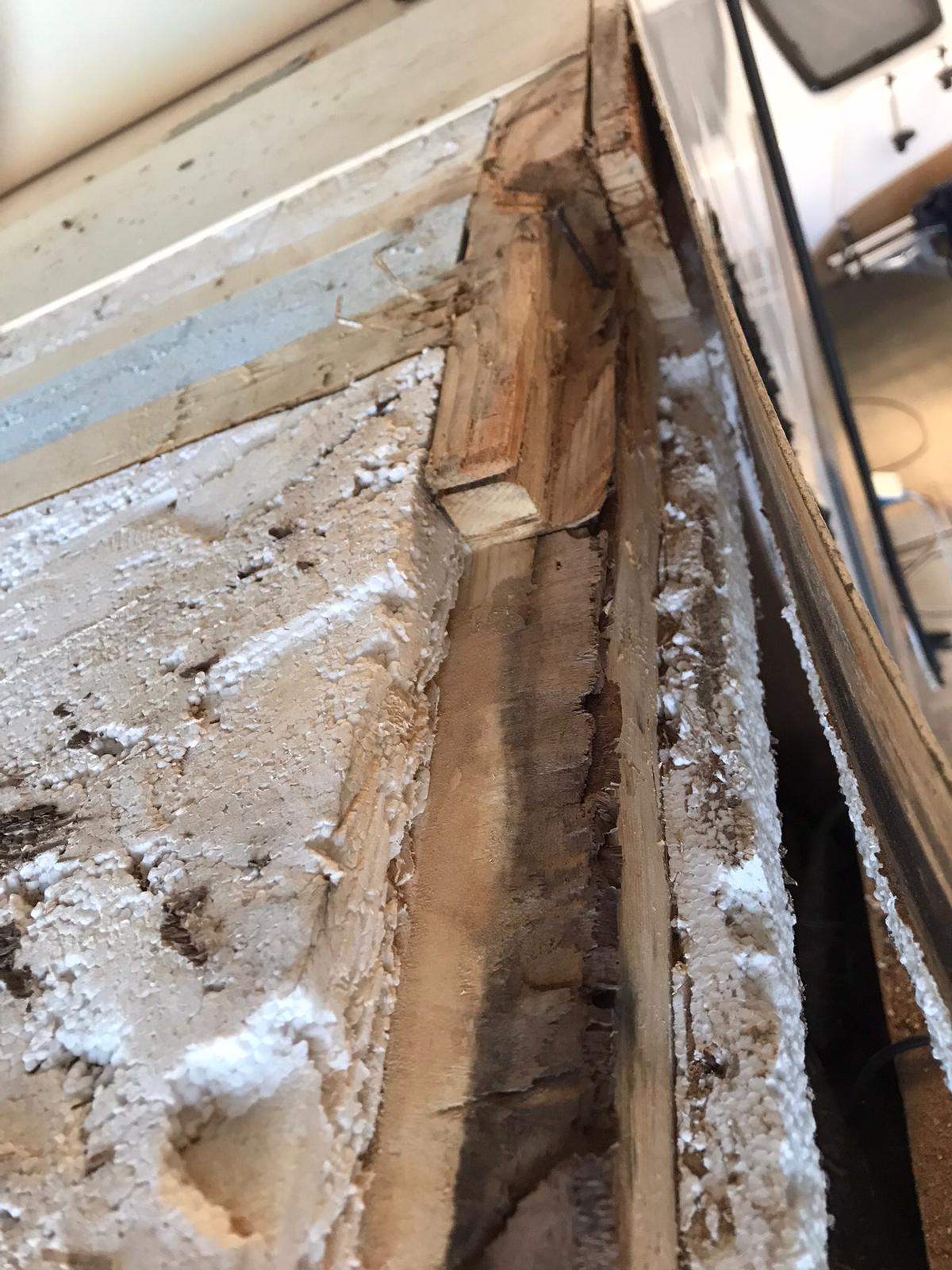 Einige Tage später wurde allerdings das ganze Ausmaß des Wasserschadens am Alkoven deutlich. Das Wasser, das oben eingedrungen war, hatte sich an der Unterseite des Alkovens wie in einer Wanne gesammelt und auch hier das Holz beschädigt. Etwa ein Drittel des Alkoven-Unterbaus (also der Teil, auf den man aus der Windschutzscheibe schaut) war betroffen, das Holz vergammelt.