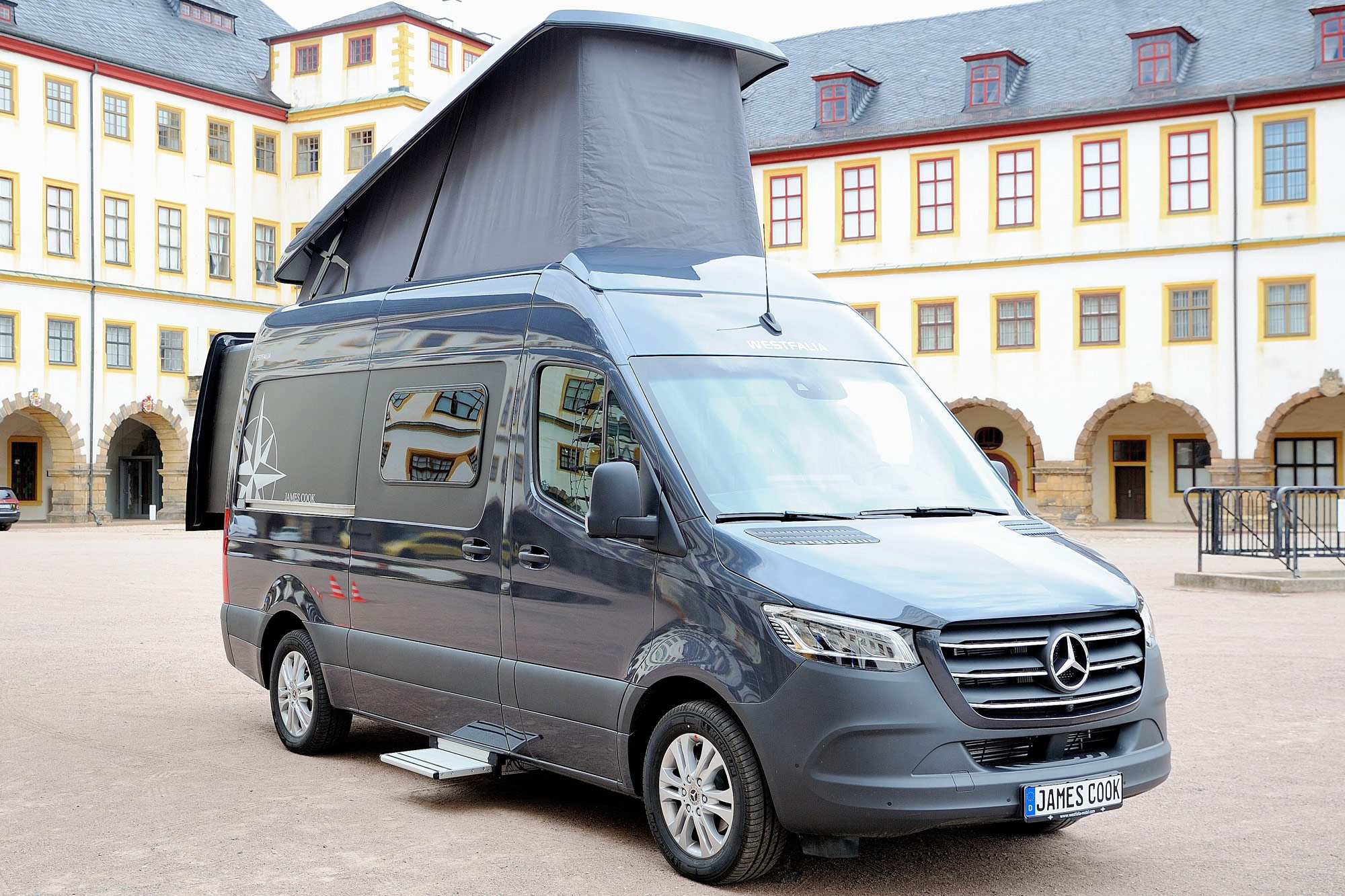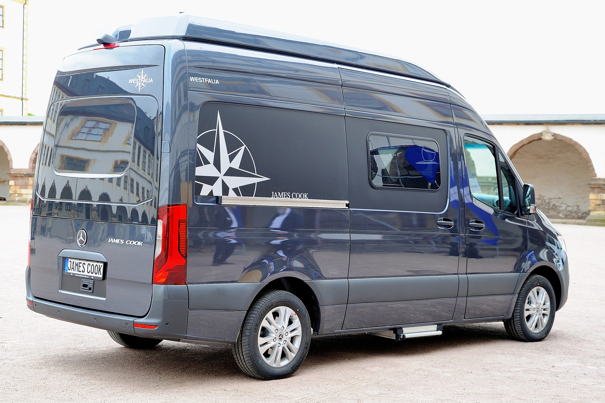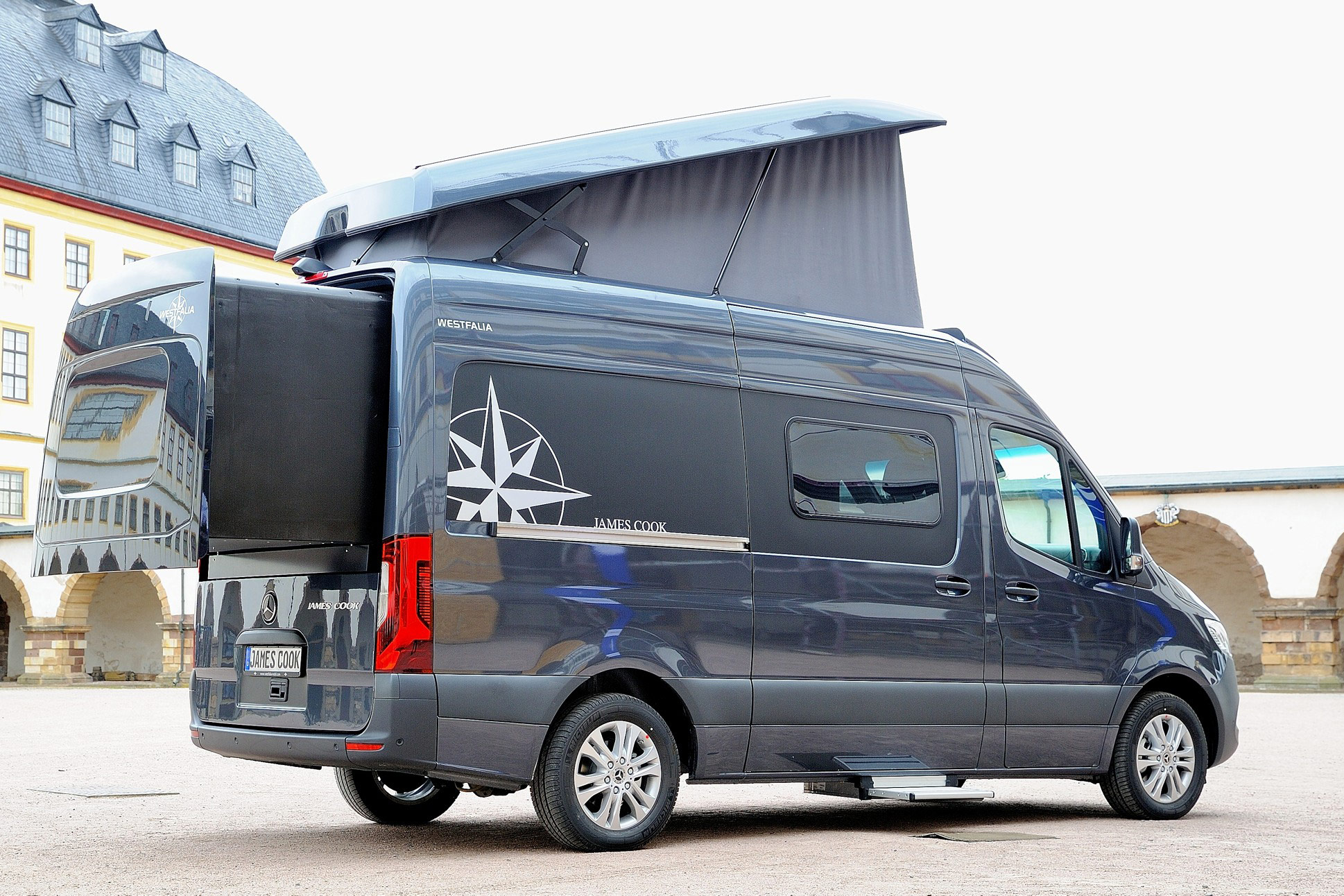 Allen Modellen gemein ist das neue von Westfalia entwickelte Slide-Out System. In weniger als 40 Sekunden fährt im Heck des Reisemobils ein Modul nach außen, und ein Schlafraum von 2,07 Metern Länge und mehr als 1,40 Metern Breite entsteht. Eine Liegefläche, die in der kompakten Kastenwagenklasse, denn der James Cook ist kürzer als sechs Meter, ein echtes Highlight sein dürfte.