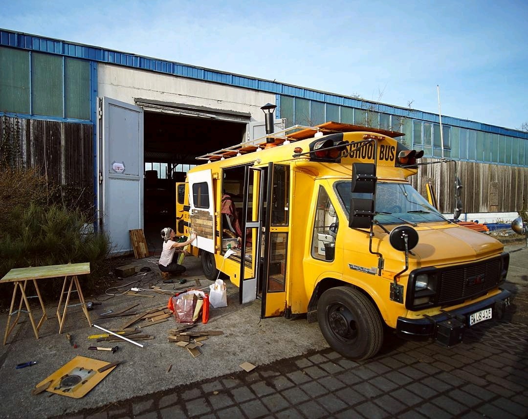 Doch die Suche von Kai in den gängigen Portalen brachte zunächst wenig Erfolg. Zumal er mit angezogener Handbremse agierte, denn Julie war anfangs nicht gänzlich von der Idee überzeugt, das Leben schon bald in einem „Camper“ zu verbringen. Doch bekanntlich kommt „unverhofft“ eben doch „oft“ und so stand das Paar eines Tages mitten in Berlin vor einem 1993er Schulbus von GMC, der ohne deutsche Papiere und etwas runtergekommen nur auf sie zu warten schien. Sie verliebten sich in den sechs Meter langen Bus mit dem 6,2-Liter-Diesel und kaufen ihn am folgenden Tag. Ihr Plan: Dieses Baby bauen wir zu unserem Zuhause auf Rädern um.