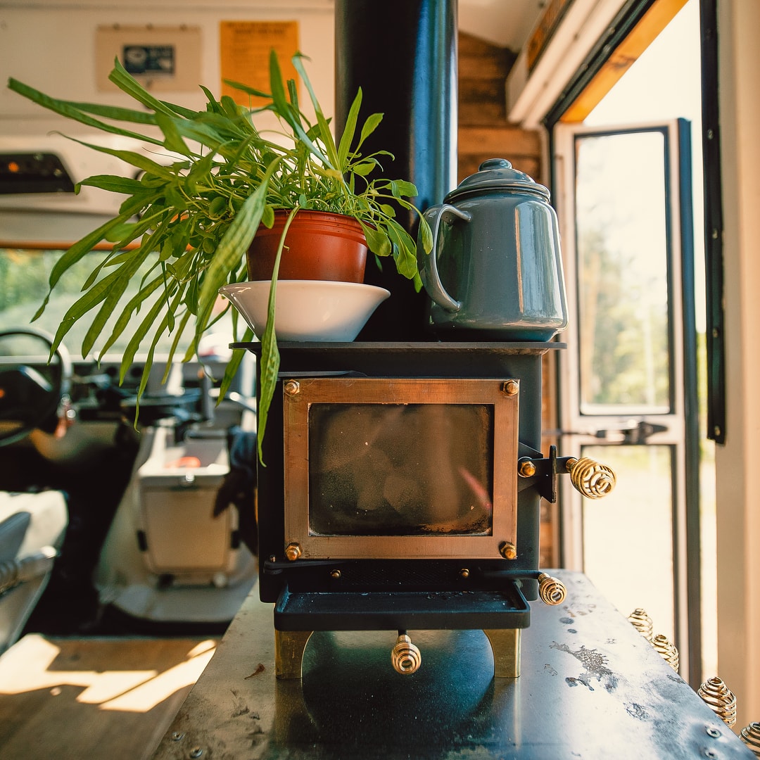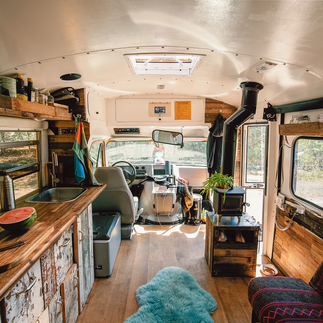 Die Prioritäten beim Ausbau des ehemaligen US-Schulbusses waren schon beim Start klar: Schlafen und Kochen! Alles andere wurde drum herum gebaut. Besonders stolz ist Kai beim Ausbau dabei auf die noch immer tadellos funktionierende Elektronik und besonders dankbar ist er für den kleinen Ofen, der ein enorme Behaglichkeit und natürlich Wärme verströmt.