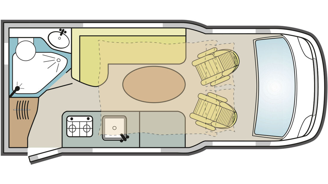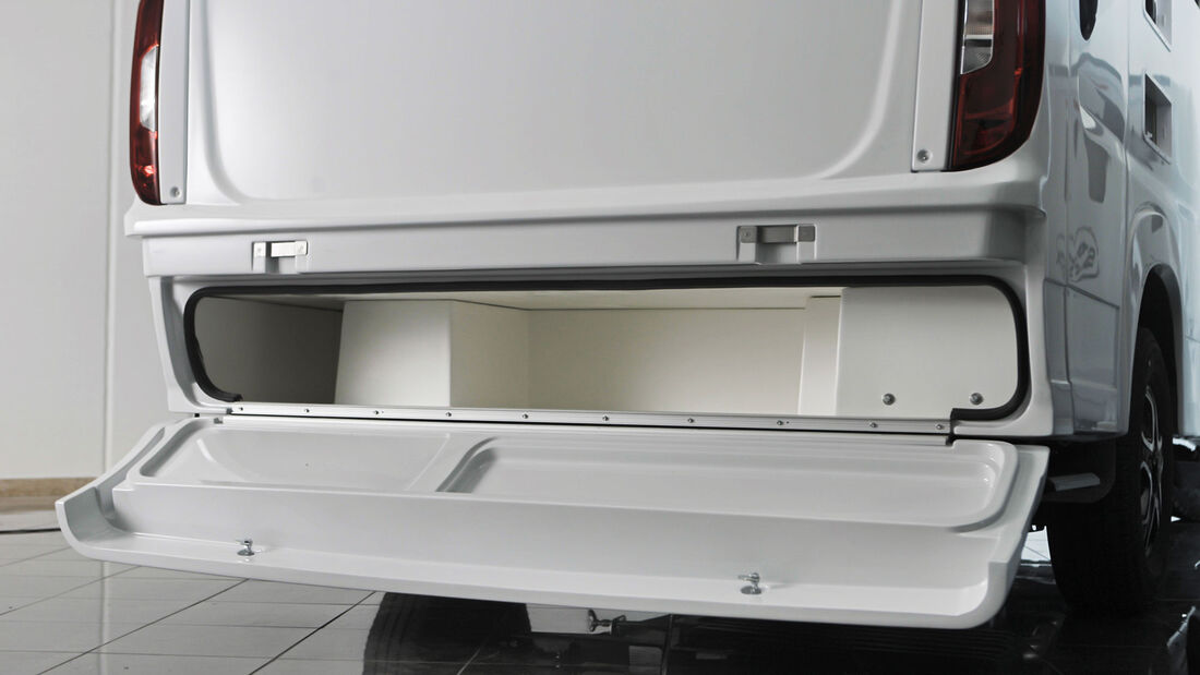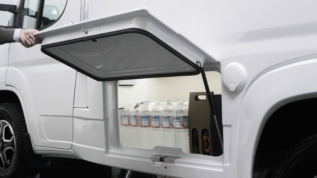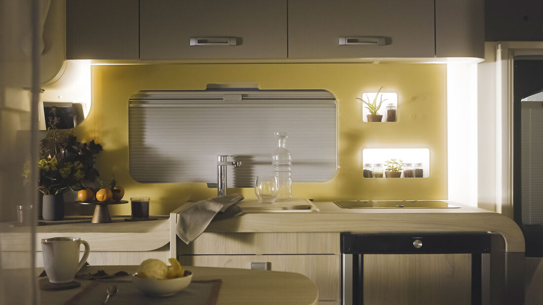 Zu den Veränderungen des 2023er Modells gehören eine verbesserte Aufbautür inkl. neuer Türscharniere, einer optimierten Trittstufe, eine Griffmulde für die äußeren Staufachklappen sowie eine neue Wandverkleidung der Längsküche. Das Gelb des hintergrundbeleuchteten Plexiglas-Panels muss man allerdings mögen. Die integrierten Staufächer indes dürften sich als sinnvoll herausstellen.
