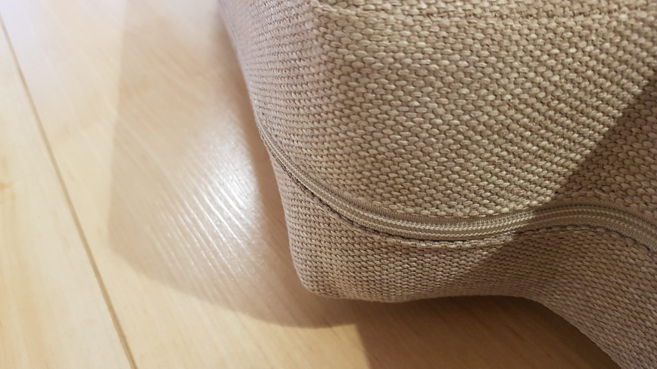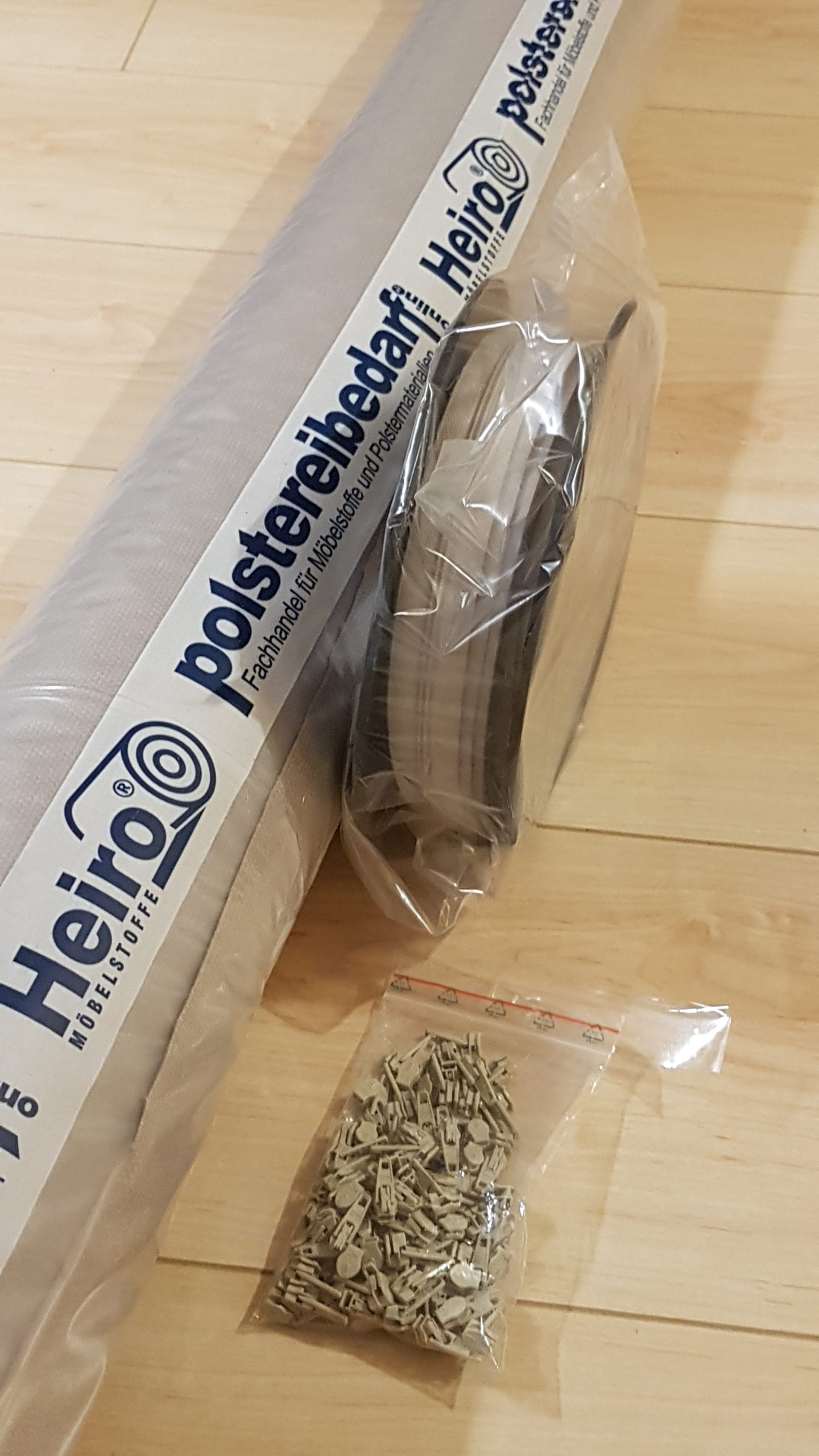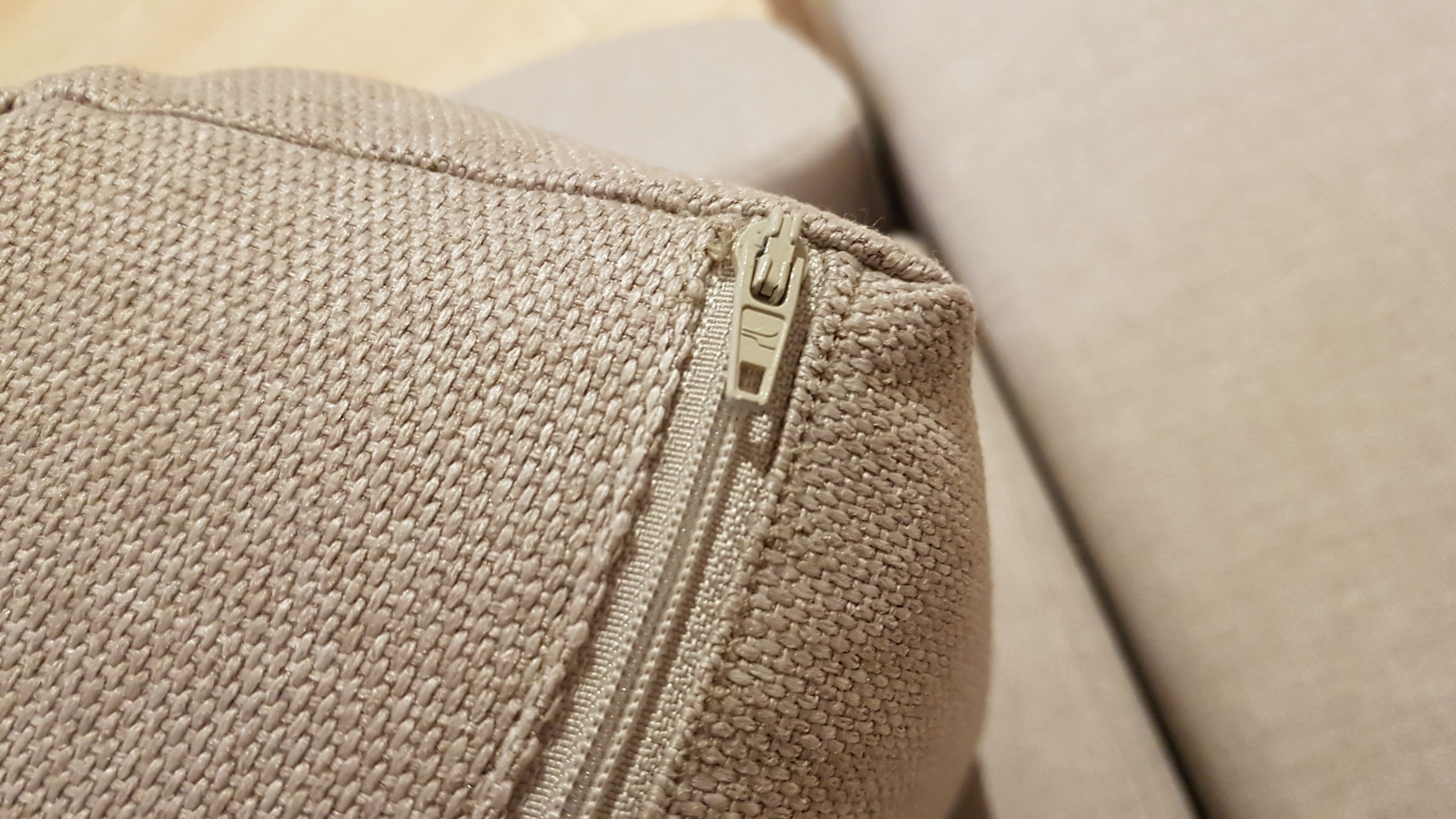 Nachdem wir uns im ersten Schritt vom Stoff überzeugt haben, folgte nun der Schritt zum Schneider. Wir haben eine kleine Änderungsschneiderei und Wäscherei im Eingangsbereich unseres REWE-Marktes und hier wurde ich kurzerhand vorstellig und fragte, ob man mir die mitgebrachten Bezüge neu anfertigen könne. „Kein Problem“ hieß es. Allerdings brauche man nicht nur die Bezüge, sondern die kompletten Polster, um die neuen Bezüge besser anpassen zu können. Für sieben größere und vier kleinere Teile (alle unterschiedlich und alle mit Reißverschluss) veranschlagte man rund 380 Euro und etwas zwei Wochen Zeit. Hinzu kamen also noch die 15 Euro/Meter Stoff sowie Reißverschlüsse (Meterware). Letztere fanden wir in passender Farbe ebenfalls bei Polstereibedarf-Online.
