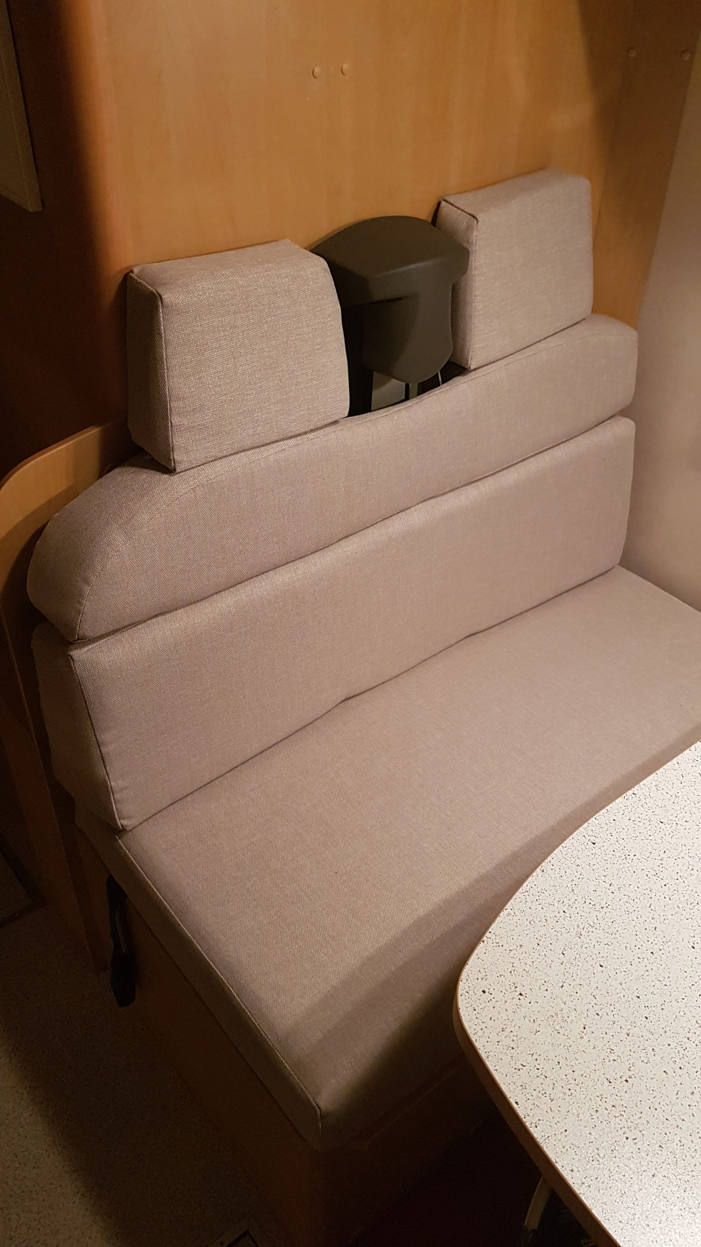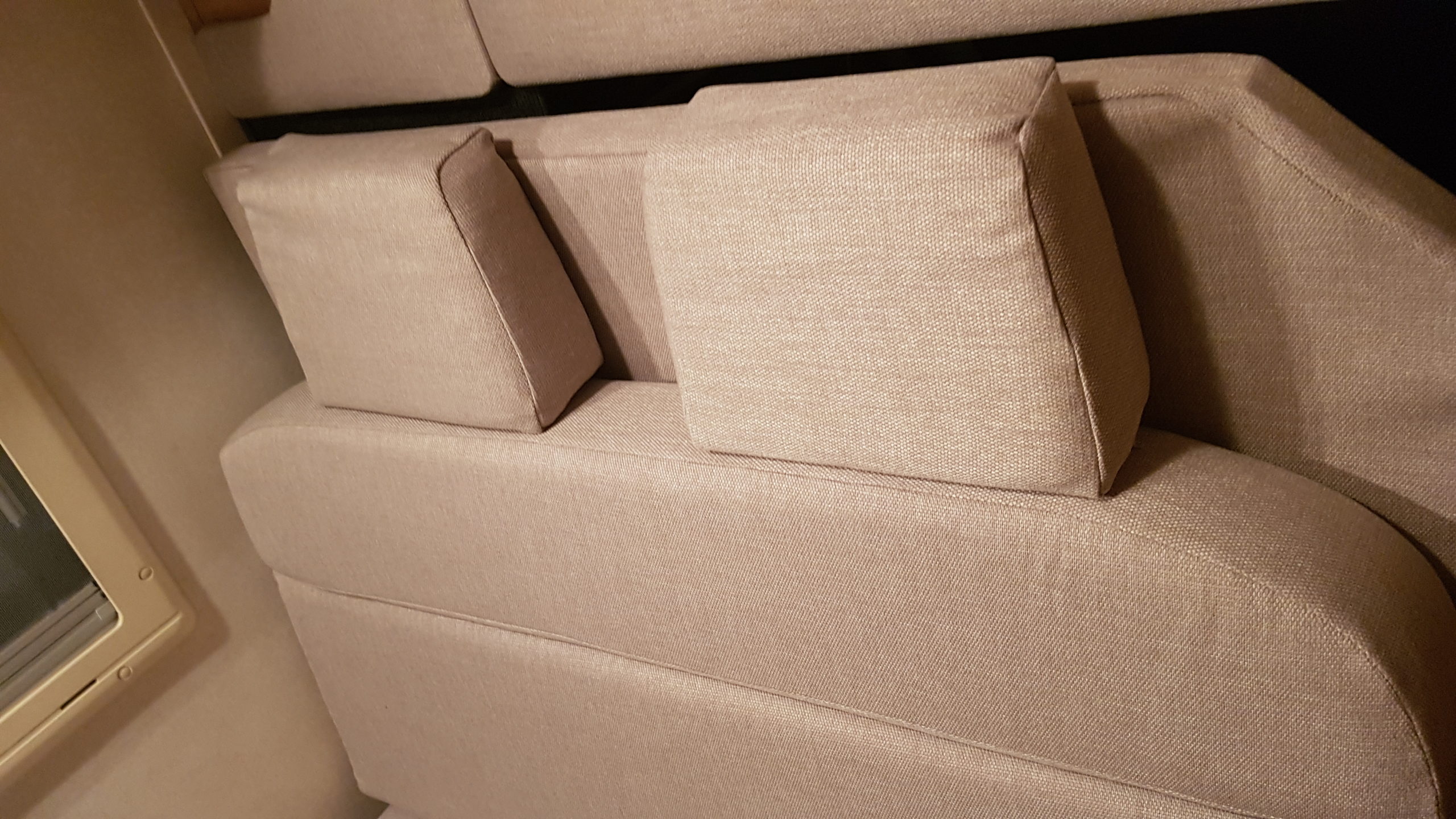 [adrotate banner=“1″]Weniger Tage später ist ein passender Stoff im Internet gefunden und erste Proben bestellt. Es soll der Polster-Stoff „Karat“ in beige von Polstereibedarf-Online sein, der dann teils in Eigenarbeit, teils vom Profi den alten, roten bzw. Leberwurst-farbenen Stoff ablösen soll. Zunächst bestellen wir rund zwei Meter, um die Blenden selbst neu zu bespannen. Das klappt dank eines guten Tackers nicht nur erstaunlich gut, auch der Stoff macht einen sensationell guten Eindruck. Neben Optik und Haptik ist es vor allem seine Schmutzabweisende Eigenschaft, die uns überzeugt hat. (Kleiner Tipp am Rande: Wir haben nicht alle Blenden neu bezogen, sondern an einigen Stellen – zum Beispiel an den Betten und der Sitzgruppe – auch einige Teile einfach abgebaut, weil sie keinen Nutzen erfüllt haben).