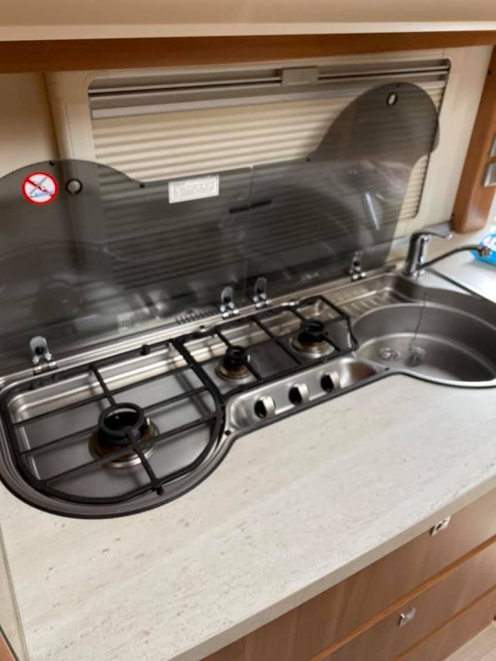 - 3-Flammen-Kocher-Spülkombination mit elektrischer Zündautomatik (12V), Zündsicherung, geteiltem Gusseisen-Gitterrost und geteilter Glasabdeckung