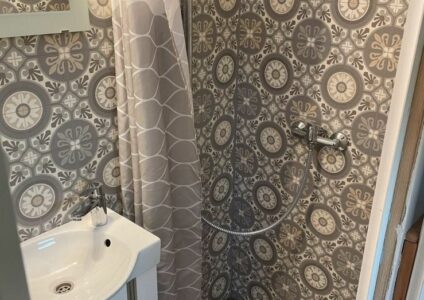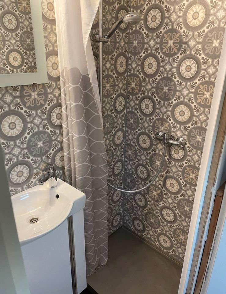 - Badezimmer mit Trenntoilette, Waschbecken und Dusche
