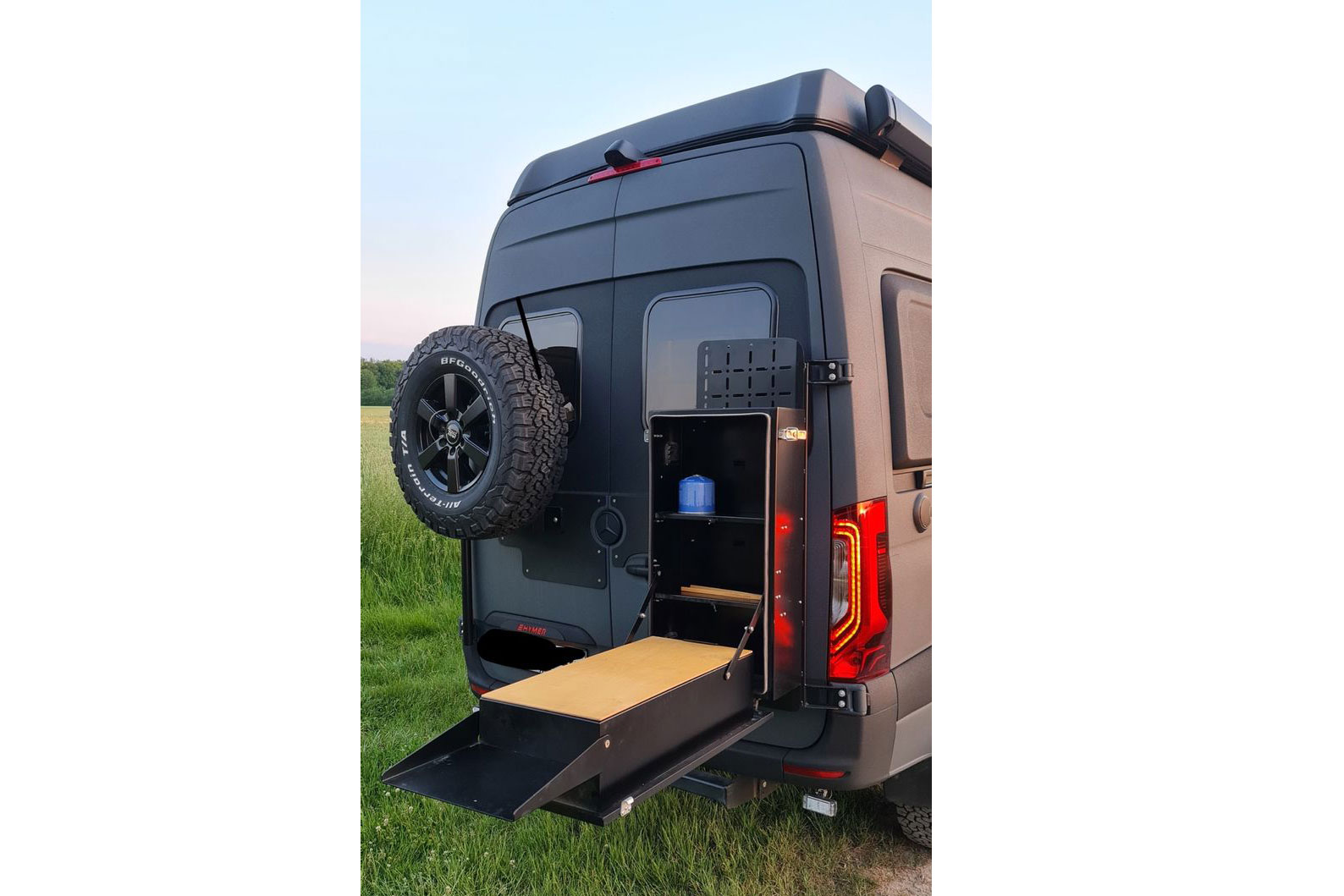 -Außenküche herausklappbar mit Klappregalen und Arbeitsplatte